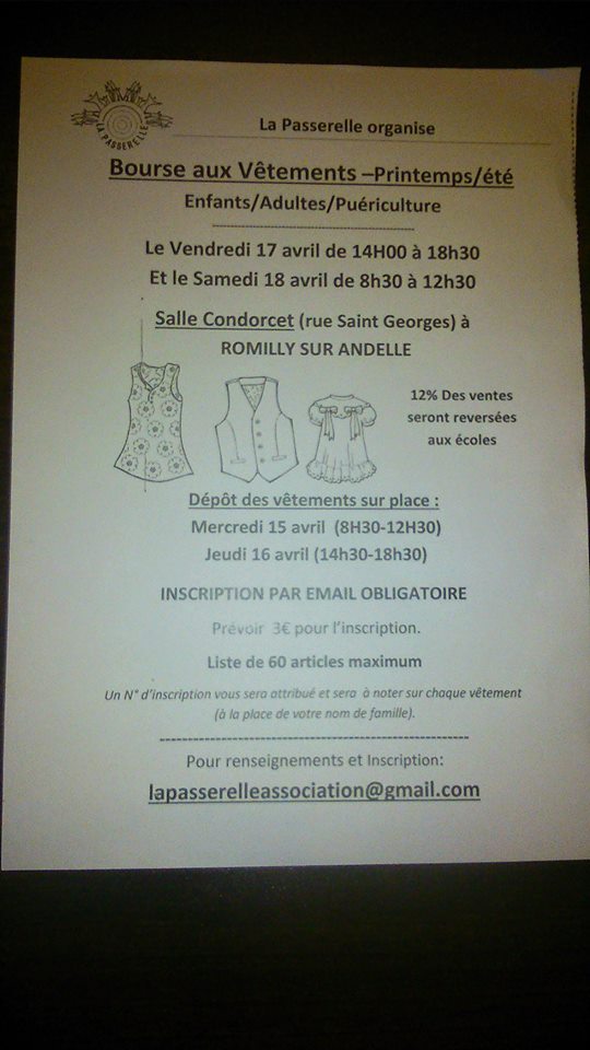 dépôts des vêtements le mercredi 15 avril de 8h30 à 12h30 et le jeudi 16 avril de 14h30 à 18h30
