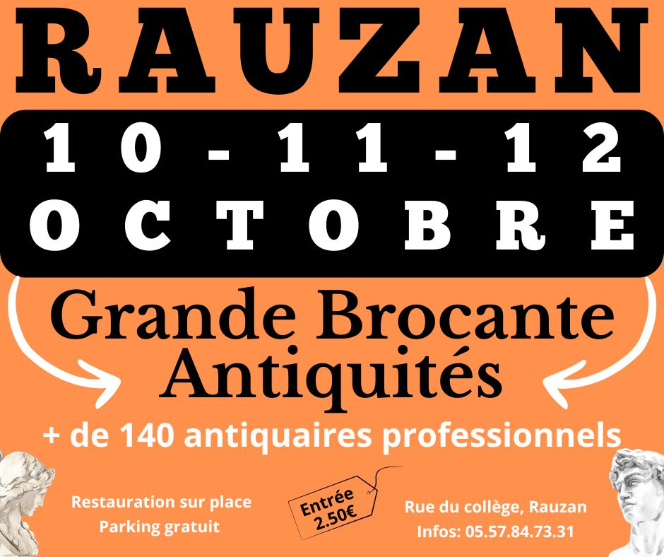 Du 10 au 12 octobre c'est ? rauzan qu'il faut ?tre! 53?me ?dition de la grande brocante antiquit?s avec plus de 140 antiquaires et brocanteurs professionnels! Nombreuses animations et restauration sur place afin de passer une journ?e inoubliable!