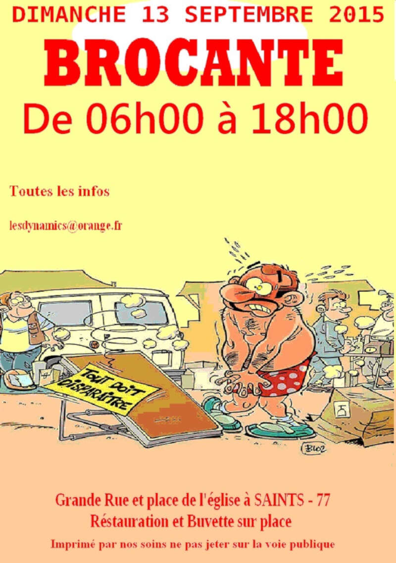 L' Association Les Dynamic's organise sa 2éme Brocante le Dimanche 13 Septembre 2015 de 06h00 à 18h00. Celle-ci se déroulera dans la rue principale et sur la place de l'Eglise du village de Saints (77) proche de la ville de Coulommiers.