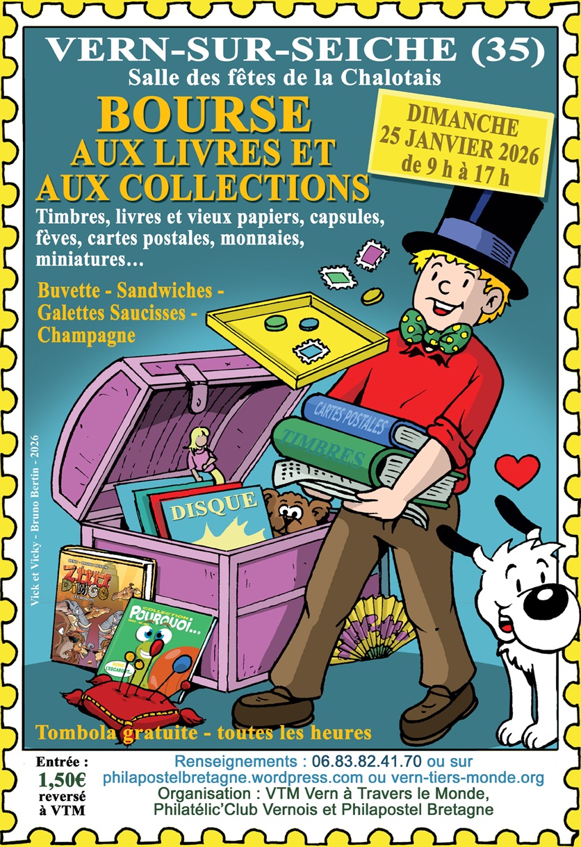 Philapostel Bretagne, Vern à Travers le Monde et le Philatelic’Club de Vern vous proposent cette Bourse aux livres et aux collections, dimanche 25 janvier 2026 à Vern sur Seiche.