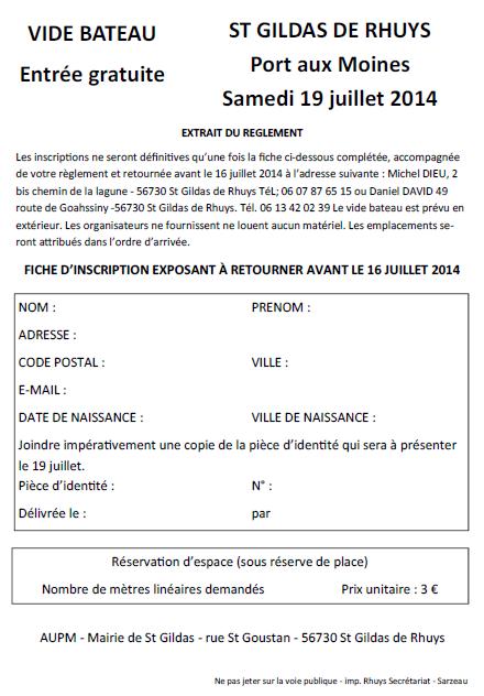 de votre règlement et retournée avant le 16 juillet 2014 à l’adresse suivante : Michel DIEU, 2 bis chemin de la lagune - 56730 St Gildas de Rhuys TéL; 06 07 87 65 15 ou Daniel DAVID 49