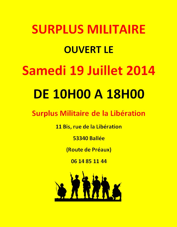 Surplus Militaire OUVERT le Samedi 19 Juillet 2014 de 10H00 Ã 18H00Envoyer un mail à un membre organisateur de l'événement